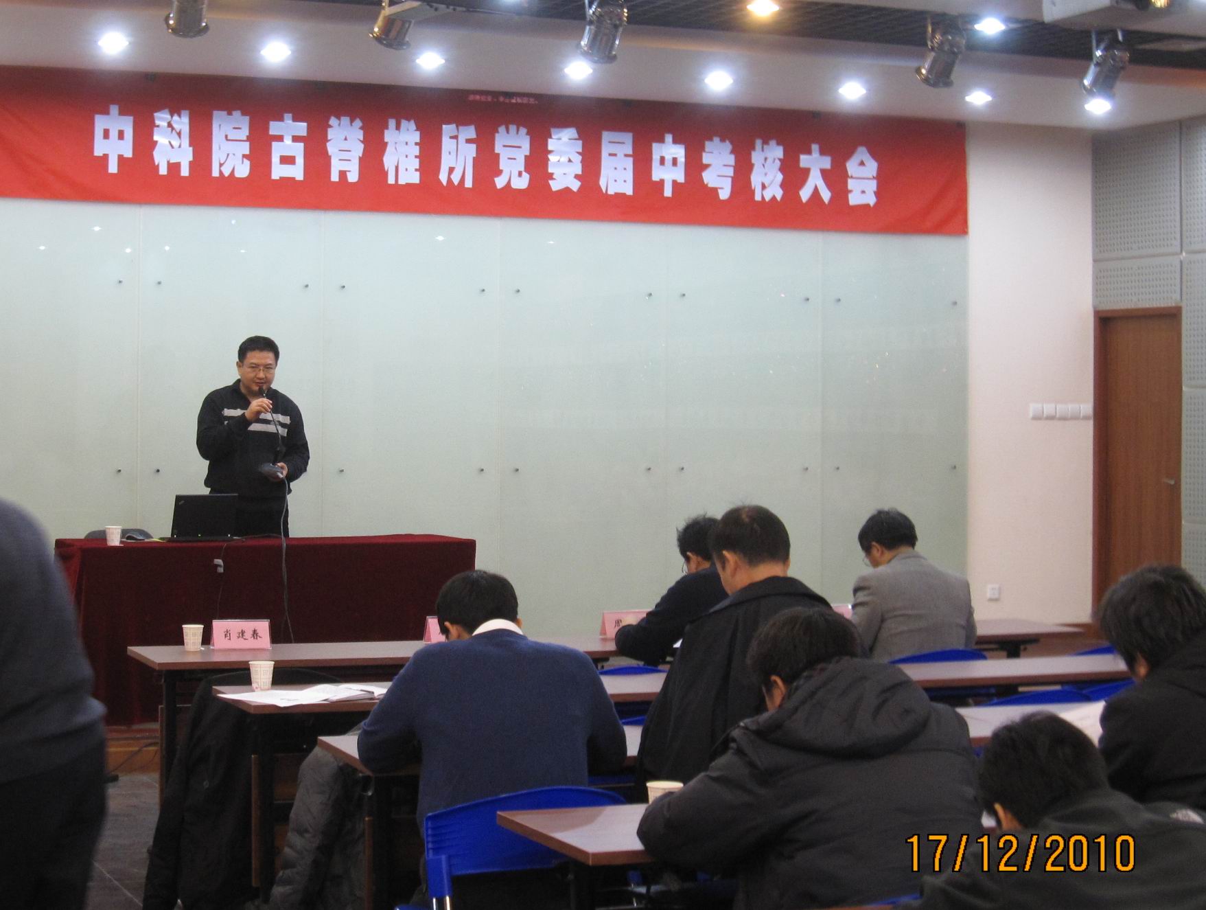 随后,党委书记董军社同志代表古脊椎所党委做《古脊椎所党委届中考核报告》,全面总结了本届党委两年多来的工作。对于今后的工作,他强调要做好四方面的工作:一要进一步发挥好党委政治核心和保证监督作用,坚持“围绕创新、服务创新、促进创新”,加强党的政治领导,提高党的影响力、凝聚力,贯彻落实好“科学院综合管理条例”等四个条例。二要进一步加强党的建设,继续深入开展创先争优活动,抓好领导干部“四个作风”,抓好党支部“五项建设”,继续带领、广大党员开展“五比五创”;充分发挥党支部的战斗堡垒作用,提高党的凝聚力和战斗力。三要加强党对群众组织的领导,推进“合格职工之家”建设。进一步完善工作制度,充分发挥群众组织在维护职工合法权益、参与民主管理和监督方面的作用。四要进一步凝练创新文化理念,不断丰富和完善创新文化核心价值体系,把“科学院精神”渗透到科技创新实践的全过程。坚持用创新文化的核心价值理念引领科研、管理和支撑工作。在创新机制体制上下功夫,进一步完善制度体系,努力创造和谐宽松科研环境。
