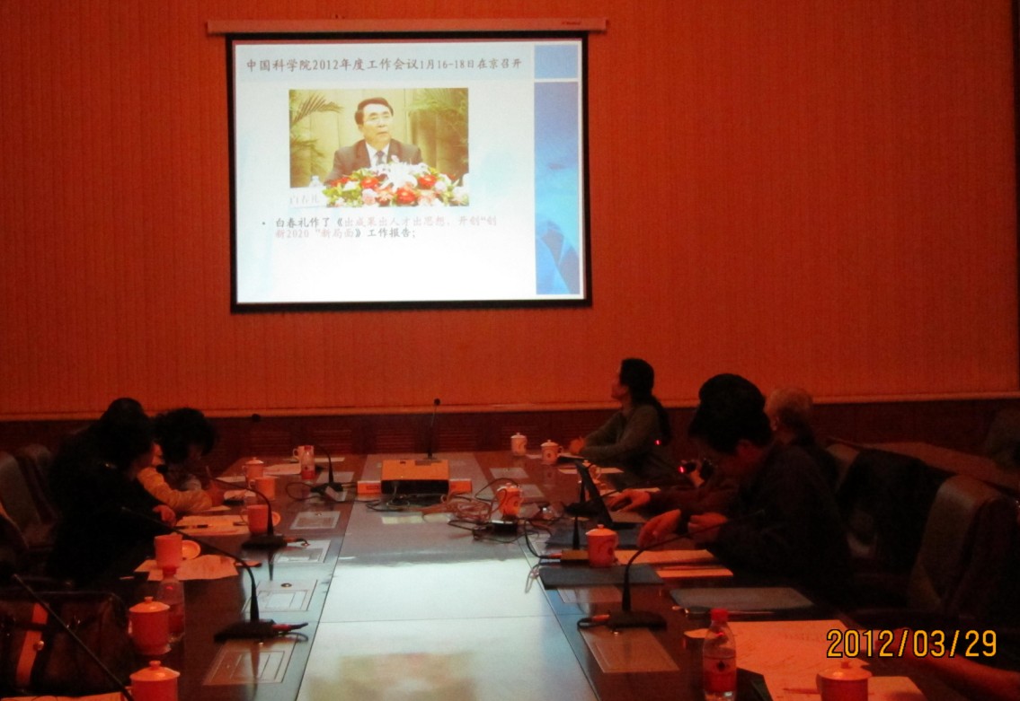 会上董军社书记传达了中科院2012年工作会议精神。他说,职工代表要认真学习白春礼院长《出成果出人才出思想,开创“创新2020”新局面》的工作报告,深入了解、深刻领会和贯彻落实我院“三位一体”战略使命、“民主办院、开放兴院、人才强院”的发展战略,紧紧围绕我所“一二三”规划的中心任务,在本职岗位上做出积极贡献,进一步加快研究所科研创新的步伐。