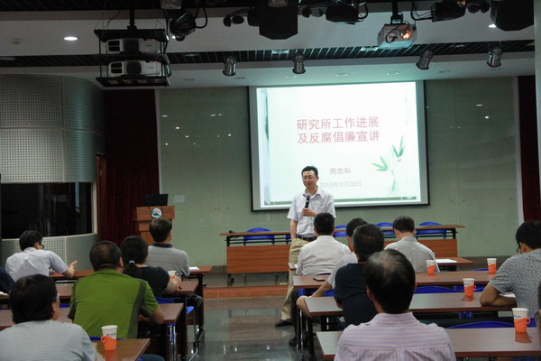 所长周忠和进行了反腐倡廉专题宣讲。他从国家反腐倡廉的形势和科研领域面临的问题,谈了对反腐倡廉建设的认识,分析了我所科研管理方面的特点,强调了我所反腐倡廉工作的重要性,加强风险防控工作的必要性,还结合白春礼院长 “三严三实”专题党课谈了学习心得,指出研究所各级干部要传承研究所的风清气正的优良传统,要经常自检、自省,严格履职,自我约束,防止腐败现象的滋生,同时通过风险防控工作,进一步加强完善我所的制度建设,提高研究所科学管理水平。随后通报了研究所近期的重要工作进展,并对今后反腐倡廉工作提出了明确要求。