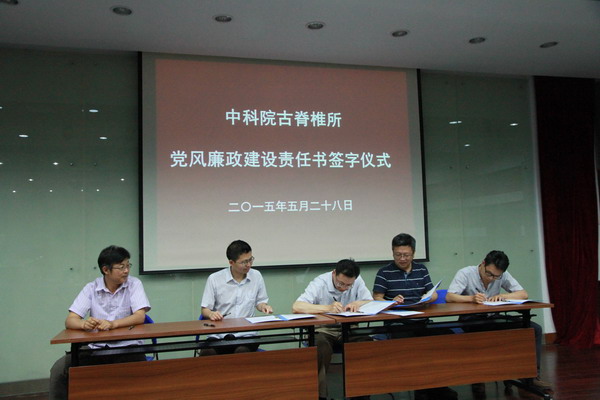 为落实院党组关于党风廉政建设责任制的工作部署,5月28日下午,古脊椎所在一楼报告厅组织反腐倡廉教育活动暨党风廉政建设责任书签字仪式。所班子成员、党委委员、纪委委员、支部书记、中层以上领导干部参加了活动。活动由党委书记、副所长苗建明主持。