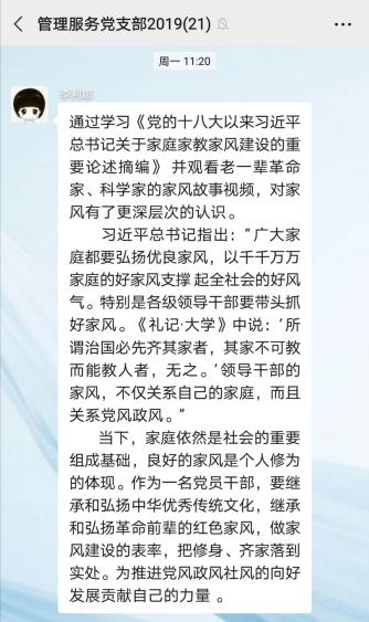 支部党员们自学了《党的十八大以来习近平总书记关于家庭家教家风建设的重要论述摘编》以及中科院继续教育平台“不忘初心,弘扬优良家风”主题党日专题中的老一辈革命家、科学家的家风故事视频,大家分享了学习体会及感想。