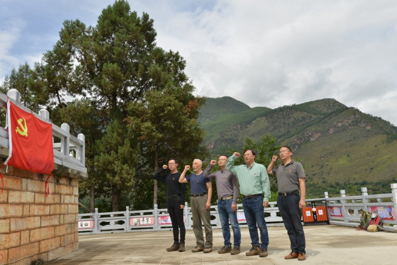 古脊椎所二次青藏科考东线考察队考察石鼓更新世地层间隙,途经石鼓镇红军过丽江博物馆,临时党小组成员在中国工农红军第二方面军长征渡江纪念碑前,缅怀先烈,谨记初心,重温了入党誓词。