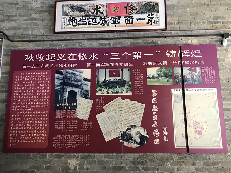 1927年9月9日,在中国革命的危急关头,毛泽东等发动和领导了湘赣边界的秋收起义。这是继南昌起义之后,中国共产党对国民党反动派叛变革命和实行屠杀政策的又一次英勇反击。修水是秋收起义的主要策源地,起义前夕,工农革命军的第一面旗帜在修水设计、制作并率先升起。9月9日清晨驻守在修水的师部及其所属一、四团,师直特务连在县城紫花墩举行了气壮山河的誓师大会,打响了秋收起义的第一枪。第二次国内革命战斗时期,老一辈无产阶级革命家彭德怀、罗荣桓、何长工、滕代远、肖克、王首道等均在修水留下了战斗的足迹。因此,秋收起义在修水有三个第一:组建我党第一支工农革命军,设计制作,并率先打出的第一面军旗,打响秋收起义的第一枪。