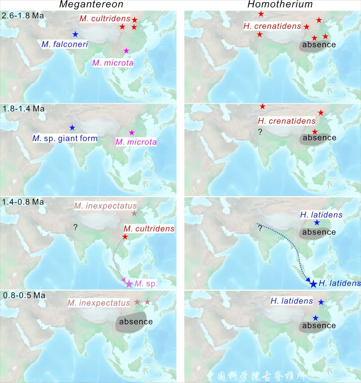 图3. 巨颏虎,锯齿虎在亚洲的地史分布和迁徙路径。