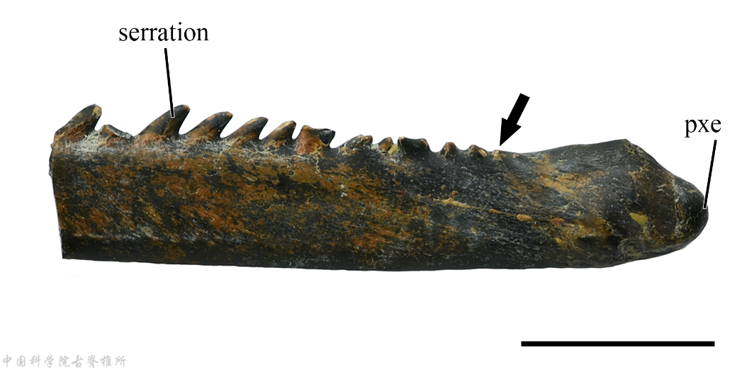 图3. 西藏伦坡拉盆地论波日剖面新材料IVPP V34023。该标本为鲤科鱼类背鳍或臀鳍的末根不分枝硬刺状鳍条,黑色箭头指示锯齿的起始着生点靠近鳍条基部。比例尺为5 mm。