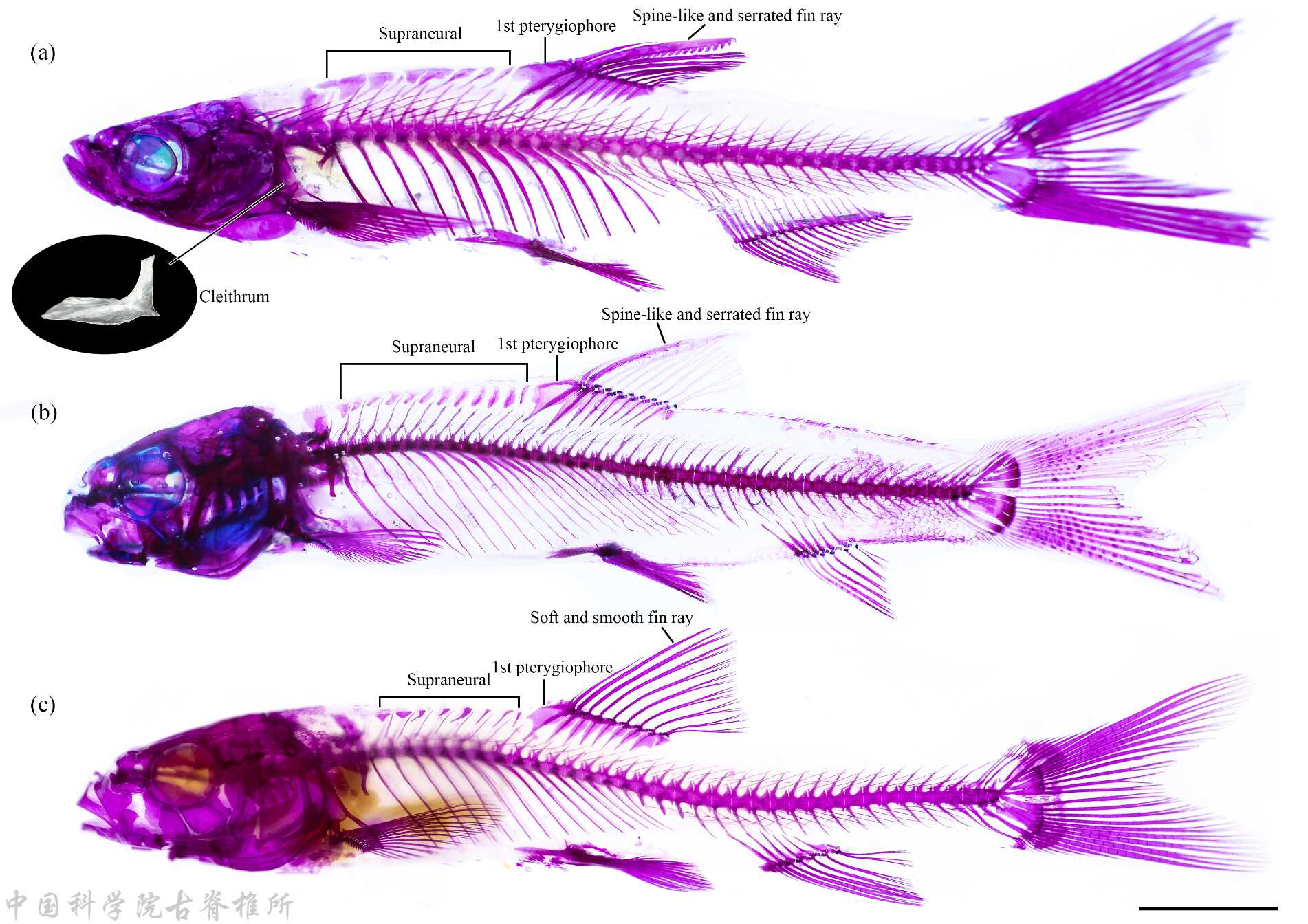 图5. 用于对比的一些现代鲤亚目中不同代表类群的透明骨骼标本。a为鲴科Toxabramis houdemeri,b为鲤科Schizothorax sp.,c为鲤科Sinocyclocheilus guilinensis(周佳俊提供该属鱼类现代标本)。比例尺为10 mm。