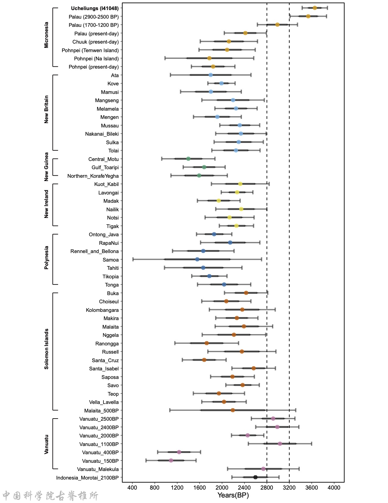 研究显示,帕劳群岛早期居民的遗传构成中,约60%来源于东亚(即南岛语族人群),40%来自新几内亚岛(即巴布亚人群),这一比例与现代帕劳人群的遗传背景高度一致(图2)。通过同位素定年,研究者发现其中两例个体的生存年代为2900-2500 calBP,正处于帕劳群岛有现代人类定居的早期(图3),这也使帕劳成为迄今所知远大洋洲地区群体遗传连续性最长的案例。