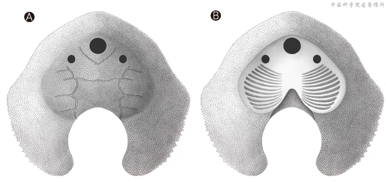 短耳鸮甲鱼在系统分类上属于盔甲鱼亚纲多鳃鱼目鸮甲鱼科,是该科目前唯一已知的属种,其名称源于头甲两侧一对短而向外突出的短耳状翼角,与猛禽短耳鸮头顶一对小短耳非常神似,因此取名短耳鸮甲鱼。这一对短耳状翼角是短耳鸮甲鱼最具辨识度的形态特征,而且在多鳃鱼目中属于首次发现。研究团队通过对多件保存完好的头甲化石进行详细的形态学研究和系统发育分析,确定了短耳鸮甲鱼的一系列形态特征:头甲呈长卵形,侧缘具明显锯齿;中背孔小且为亚圆形;腹环异常宽阔,鳃囊数量达12 对;头甲表面布满粗粒状瘤点。同时,其还具有宽大的叶状内角,感觉管系统发育完整,呈现典型的多鳃鱼类特征。