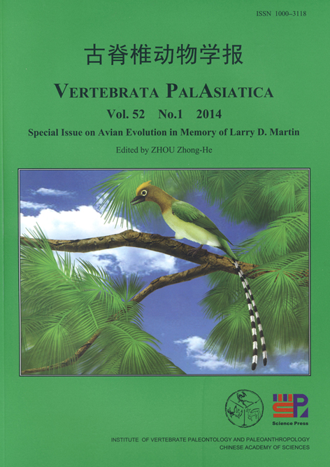 封面说明:鹏鸟(Pengornis)复原图。鹏鸟是早白垩世已知体型最大的反鸟类,在此之前仅发现1件标本,即侯氏鹏鸟(Pengornis houi)的正型标本。侯氏鹏鸟兼有反鸟类和今鸟类的特征,揭示了今鸟类和反鸟类间复杂的特征演化模式。在与其进行详细的形态学对比之后,最近发现于辽宁九佛堂组的1件保存近乎完整的亚成年鸟类标本被归入鹏鸟未定种。新标本提供了之前未能良好保存的鹏鸟的其他解剖学特征,根据其保存的胸骨显示的特征,可以探讨早期鸟类胸骨的演化。详见本期胡晗等人文。(绘图:史爱娟)