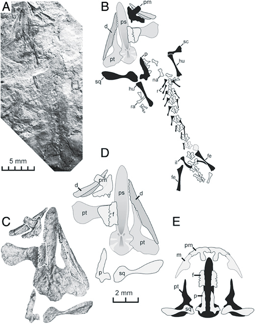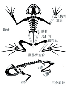 上图为现生蛙类,下图为马达加斯加早三叠世的三叠原蛙