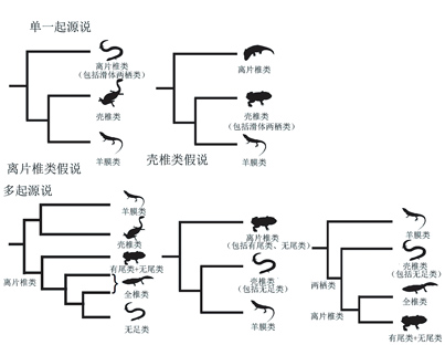 争论已经超过百年,但是到现在依然没有解决。目前流行的假说包括单一起源说以及多重起源说。单一起源包括“离片椎类假说”及“壳椎类假说”。传统的离片椎类假说认为滑体两栖类在古生代从双顶螈类中的amphibamids分化出来。最近有人提出仅蛙类及蝾螈如此,蚓螈类可能是三叠纪晚期从全椎类分化出来。多重起源说认为蛙类及蝾螈与离片椎类关系最近,而蚓螈类来源于壳椎类。