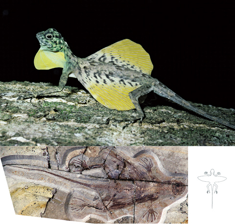 左图:长鳞龙化石及复原图;右图:韦格替蜥科动物的化石和复原图
