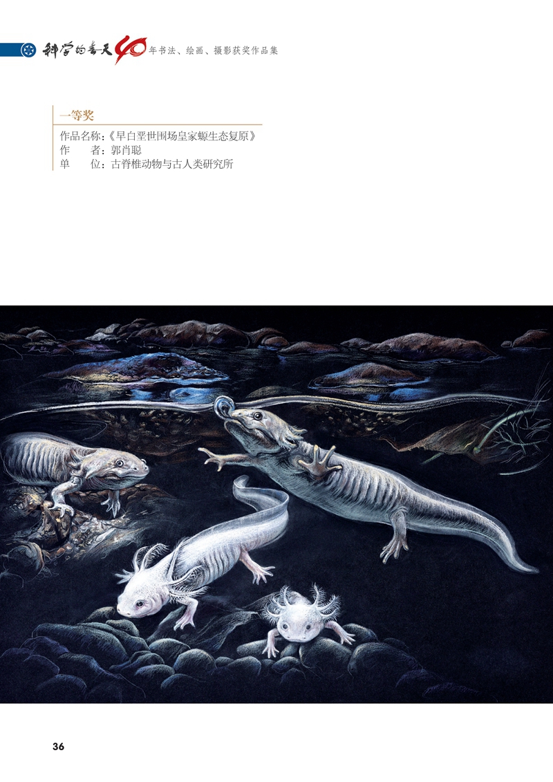 这7件作品,分别荣获中科院两个一等奖、两个二等奖、两个三等奖和一个优秀奖,分别是郭肖聪的《早白垩世围场皇家螈生态复原》荣获绘画一等奖,张绍光的《践行者》荣获摄影一等奖,许勇的《许氏禄丰龙再造像》和陈津的《劝学》荣获书法二等奖;许勇的《云南貘生态复原》和史爱娟的《阿霍氏树贼兽生态复原》荣获绘画三等奖;李士杰的《戈壁考察》荣获老照片的故事优秀奖。