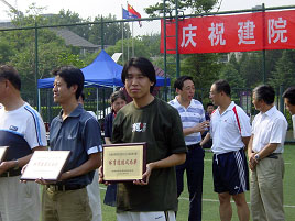 在持续六场的比赛中,队员们战烈日、冒大雨,奋力拼搏,发挥球技,打入了许多精彩的进球。虽未赢得比赛,但在比赛中所表现出优良的文明素养、不畏强手的拼搏精神、以及优秀的团队合作精神,赢得了对手的尊重和观众的喝彩,获得了比赛组委会颁发的“体育道德风尚奖”,为我所赢得了荣誉。
