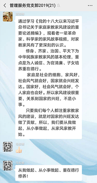 支部党员们自学了《党的十八大以来习近平总书记关于家庭家教家风建设的重要论述摘编》以及中科院继续教育平台“不忘初心,弘扬优良家风”主题党日专题中的老一辈革命家、科学家的家风故事视频,大家分享了学习体会及感想。