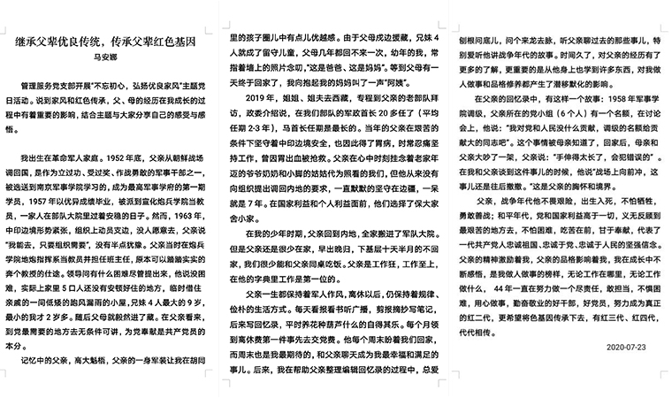 部分支部党员在自学后,结合自身经历讲述了自己的家风故事。马安娜撰写了《继承父辈优良传统,传承父辈红色基因》一文,与大家分享了自己的家风和红色传承故事,以及成长过程中的感受与感悟。战争年代的不畏艰险,不怕牺牲;和平年代的吃苦在前,甘于奉献。这样的精神融入家风,影响着下一代的成长,成为后代做人做事的榜样。