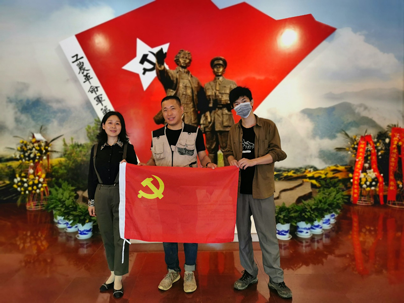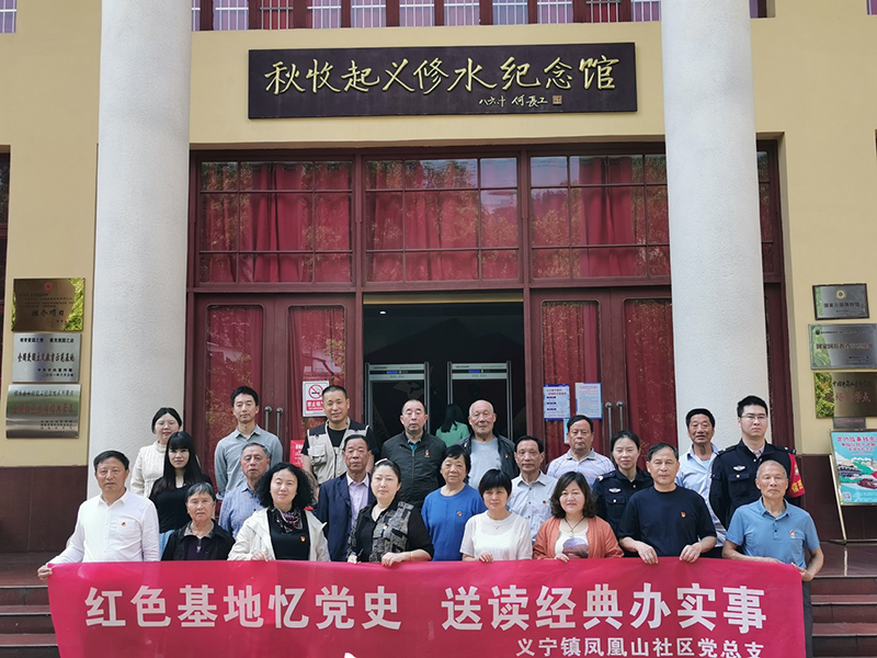 在五四青年节和中国共产党建党100周年之际,古脊椎所研究室第一党支部成立若干野外临时党小组,将党史学习和野外科学考察工作有机结合,采取灵活多样的方式进行党史学习。江西修水县太阳升镇是中国志留纪早期脊椎动物一个非常重要的化石点,其中志留纪上红层产中华盔甲鱼、裂吻鱼和修水鱼等无颌类化石,连续几年的修水野外工作,近年来野外考察队又在志留纪下红层清水组发现了一个更早动物群。5月8日,在辛苦的野外挖掘之余,盖志琨副研究员等一行三人来到位于修水县城凤凰山路136号的秋收起义修水纪念馆,进行了一次意义深远的党史学习,并参加了义宁镇凤凰山社区党总支组织的“红色基地忆党史,送读经典办实事”活动。