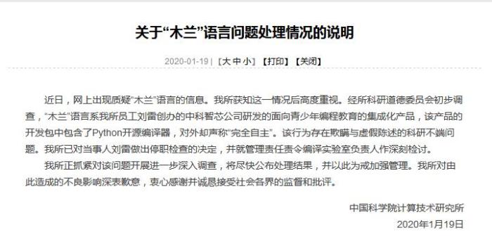 中新网1月19日电 据中科院计算技术研究所网站消息,近日,网上出现质疑“木兰”语言的信息。经初步调查,该产品的开发包中包含了Python开源编译器,对外却声称“完全自主”。该行为存在欺瞒与虚假陈述的科研不端问题。目前,已对当事人刘雷做出停职检查的决定,并就管理责任责令编译实验室负责人作深刻检讨。
