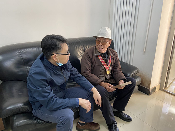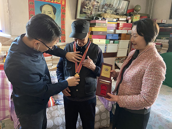 10月19日,古脊椎所党委副书记、纪委书记魏涌澎、党宣处副处长刘庆国及离退办的同志一起走访慰问了我所健在的抗美援朝老战士黄肇初、刘增、陈士航。魏书记亲切转达党中央的深切关怀和爱护,并郑重地为他们佩戴纪念章,与老战士们促膝交谈,详细询问他们当年在朝鲜战场作战的情形,共同回忆那段峥嵘岁月,叮嘱老同志保重身体,保持积极阳光心态,安享幸福晚年。