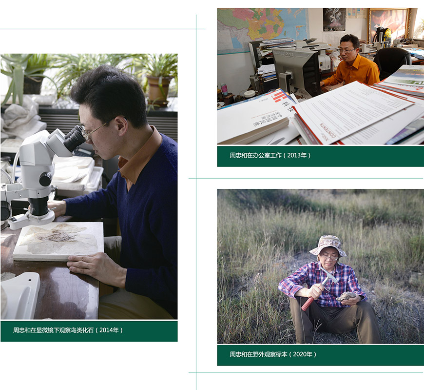 Born in Jiangdu, Jiangsu Province, Zhou Zhonghe is a paleornithologist. He received his Ph.D. from the University of Kansas in the USA in 1999. He specializes in the origin of birds, the origin and evolution of bird flight, the evolution of feathers, the early evolution and radiation of birds, feathered dinosaurs, pterosaurs, biostratigraphy, and the evolution of Mesozoic continental biota in relation to the environment. Zhou discovered and named many Mesozoic bird fossils, and published evidence supporting the theory of the dinosaurian origin of birds and their arboreal origins. He studies theoretical issues such as evolutionary systematics, ecological differentiation, and dietary diversification among early birds, and he has contributed to the public understanding of early birds. Zhou was selected as an academician of the Chinese Academy of Sciences in 2011. He also worked as the president of the International Paleontological Association, an academician of TWAS, and a corresponding academician of the Brazilian Academy of Sciences. He served as the ninth and tenth director of the IVPP.