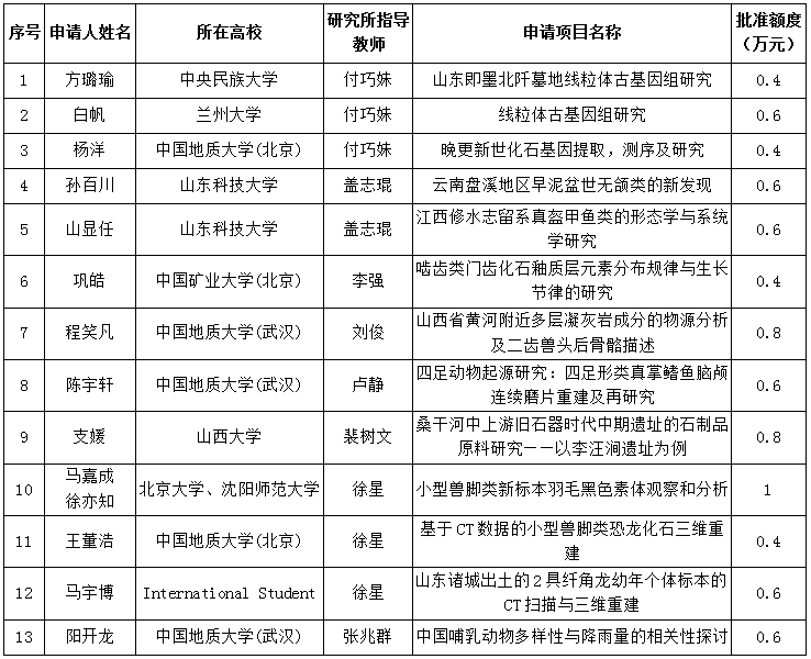 经学生申请、导师推荐、综合评审,中科院古脊椎所2018年“科创计划”获资助项目名单公布如下:
