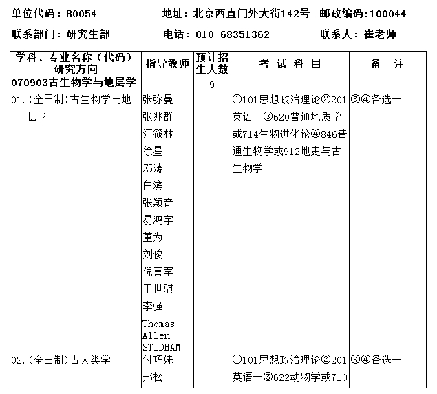 中国科学院古脊椎动物与古人类研究所2018年攻读硕士学位研究生招生目录