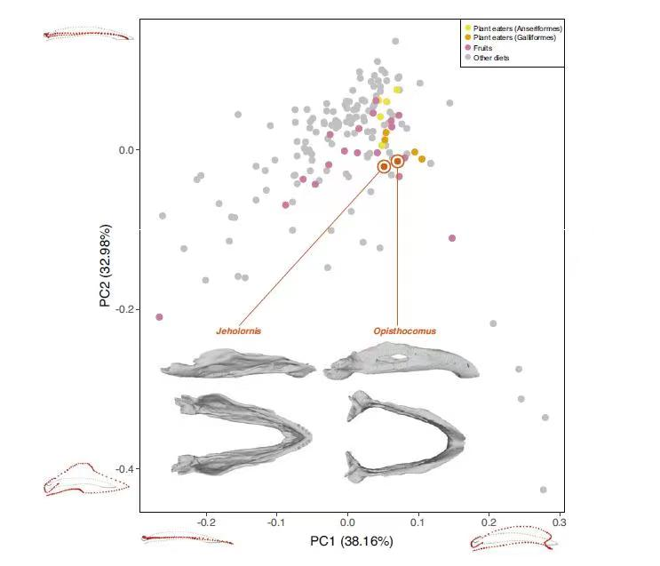 包括热河鸟和现存鸟类在内的三维下颌形状PCA图,重点与现存植食性鸟类对比