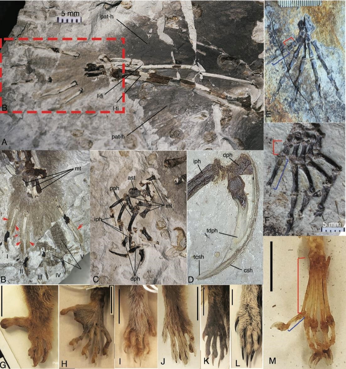图3.蔡氏奇异齿兽足部软组织形态与现生标本对比