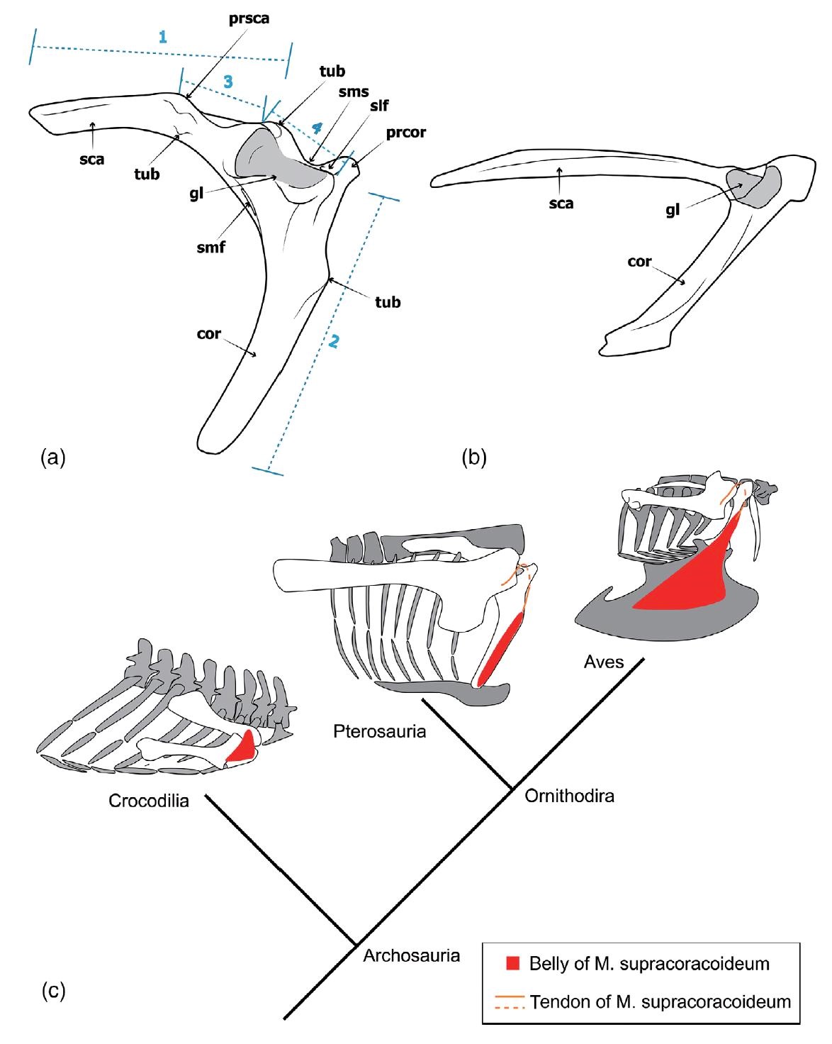 中生代的翼龙是最早演化出动力飞行的爬行动物,早于鸟类约7000万年征服蓝天,其飞行机制激发了人们对飞行探索的欲望。翼龙的皮膜翼让一些早期学者认为它们的飞行类似蝙蝠。但随着研究揭示了翼龙与鸟类具有更近的系统发育关系,后来的学者更多以鸟类作为翼龙飞行研究的参照对象。翼龙显然具有一些与鸟类相似的肩带特征,包括马鞍状的肩臼窝,柱状的乌喙骨及非常发育的顶乌喙突等。但翼龙缺少叉骨,肩胛骨与背椎构成关节,且有愈合的肩胛乌喙骨等特征则明显与鸟类不同。以往研究也注意到翼龙和鸟类的飞行机制之间可能存在差异,比如喙上肌可能不是翼龙翅膀上扬的主要动力,但这些结果并未得到广泛的认可。