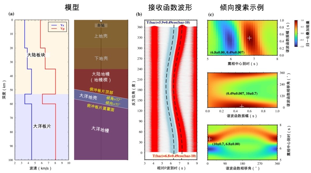 中国科学院地质与地球物理研究所岩石圈演化国家重点实验室岩石圈演化动力学学科组博士生冯铭业与导师陈凌研究员、新加坡南洋理工大学韦生吉副教授等利用远震P波接收函数波形随反方位角的谐波变化特征,提出了定量估计俯冲板片界面倾向的新方法,并将该方法命名为倾向搜索法(图1)。地震波正演测试表明,倾向搜索法能够较为准确地约束俯冲板片界面的倾向,并且在噪声水平相对较高、存在一定地壳和地幔各向异性、远震数据反方位角覆盖不完整或不均匀,以及上述因素同时存在的情况下均表现出较高的稳健性。除了估计界面倾向,倾向搜索法还能够同时应用于俯冲板片的分层性分析,估计波速间断面深度和速度异常层厚度,因此对俯冲板片结构也具有较好的约束。倾向搜索基于单个地震台站,获取台站下方结构,无需密集台阵,因此适用于地震台站稀疏的情况。