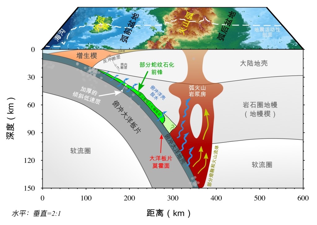 图3苏门答腊俯冲带综合解释模型。弧前地区俯冲板片顶部的倾斜低速层解释为洋壳和地幔楔部分蛇纹石化层共同构成的低速体,即俯冲板片脱水在其上界面附近形成部分蛇纹石化地幔橄榄岩层,从而构成扩散型俯冲板片边界