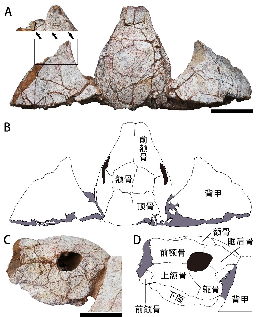 图1. 杨氏南雄龟的照片和线条图。其中A-B为背视,C-D为头骨左侧视,比例尺代表5 cm。据Ke等(2023)修改。