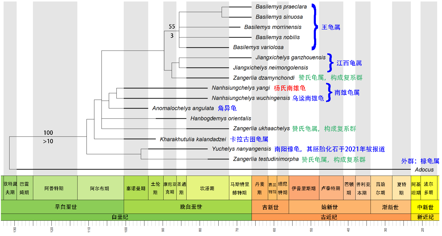 科研人员对杨氏南雄龟的性状进行编码,随后将其加入了南雄龟科的系统发育矩阵,并进行了系统发育分析。计算结果显示杨氏南雄龟和乌迳南雄龟构成姐妹群,二者和来自日本的角异龟(Anomalochelys angulata)构成一个单系群(图2)。支持这一单系群的共有衍征包括椎板宽、第一椎盾的侧缘向前收缩、颈盾长宽等长、背甲的长宽比大于1.6。尽管上述物种在地理位置上距离较远(中国广东、日本北海道),系统发育分析的结果仍然支持它们具有较近的亲缘关系。造成这种现象的可能原因是:日本海在白垩纪中晚期尚未形成,因此亚欧大陆东缘和日本岛弧仍然具有地理联系,这允许南雄龟在上述区域生存和迁徙。