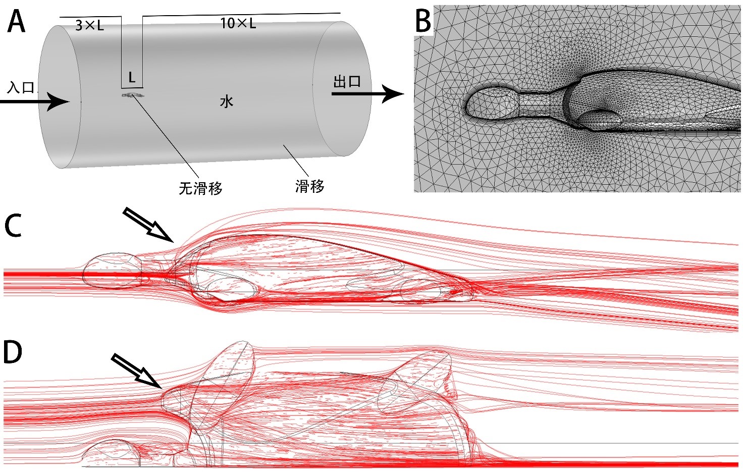 图3. 针对南雄龟三维模型开展的计算流体力学研究。A. 杨氏南雄龟的三维模型、计算域和边界条件;B. 网格划分(局部);C-D. 杨氏南雄龟周围水流的流线图,分别为左侧视和背侧视(局部),其中箭头指示角状突的位置。据Ke等(2023)修改。