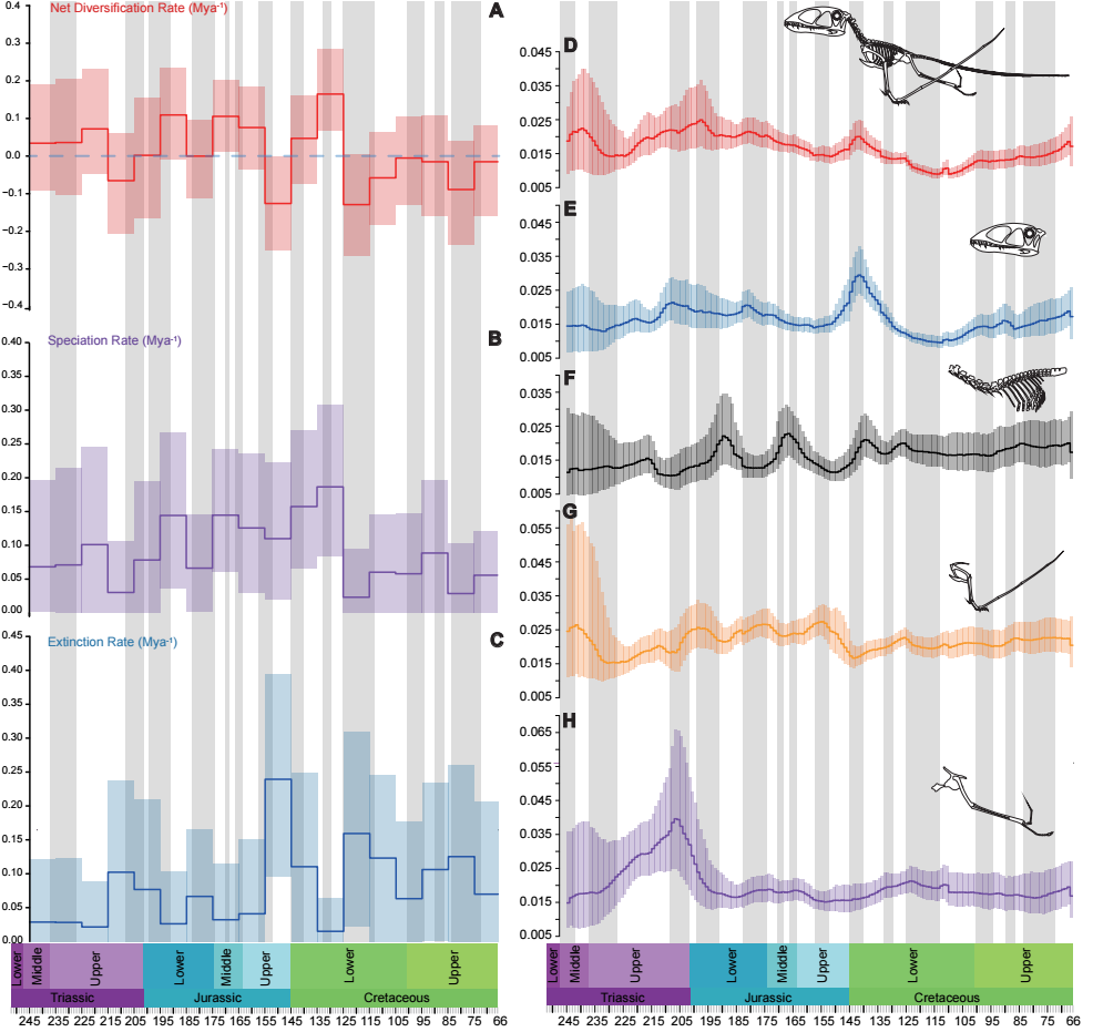 翼龙的晚三叠世辐射伴随着肩带前肢骨骼的演化速率增加,说明这一次辐射是由于占据天空生态系统导致的。在侏罗纪时期的持续多样化则伴随着全身骨骼演化速率的增加。早白垩世辐射伴随着平均体型逐渐增大及头骨演化速率的增加。该次辐射可能与进入“大型化生态位”有关,而头骨冠饰多样化可能是头骨演化速率上升的主要原因。翼龙的净成种速率在晚侏罗世与早白垩世的边界处存在一次显著的下降,且这次下降是由于灭绝速率大幅度提升导致的。与此同时,早期鸟类的净成种速率和形态多样性在该段时间里呈现出上升趋势。这一结果支持了早期鸟类对小型翼龙存在竞争排除的假说。虽然早白垩世的大型翼龙避免了与同时期鸟类的竞争,然而鸟类的形态多样性和体型多样性在白垩纪时期持续增加,晚白垩世的翼龙可能依然需要面对来自鸟类施加的竞争压力。