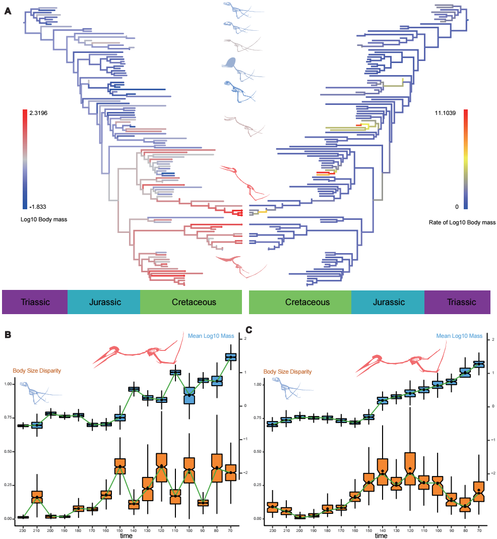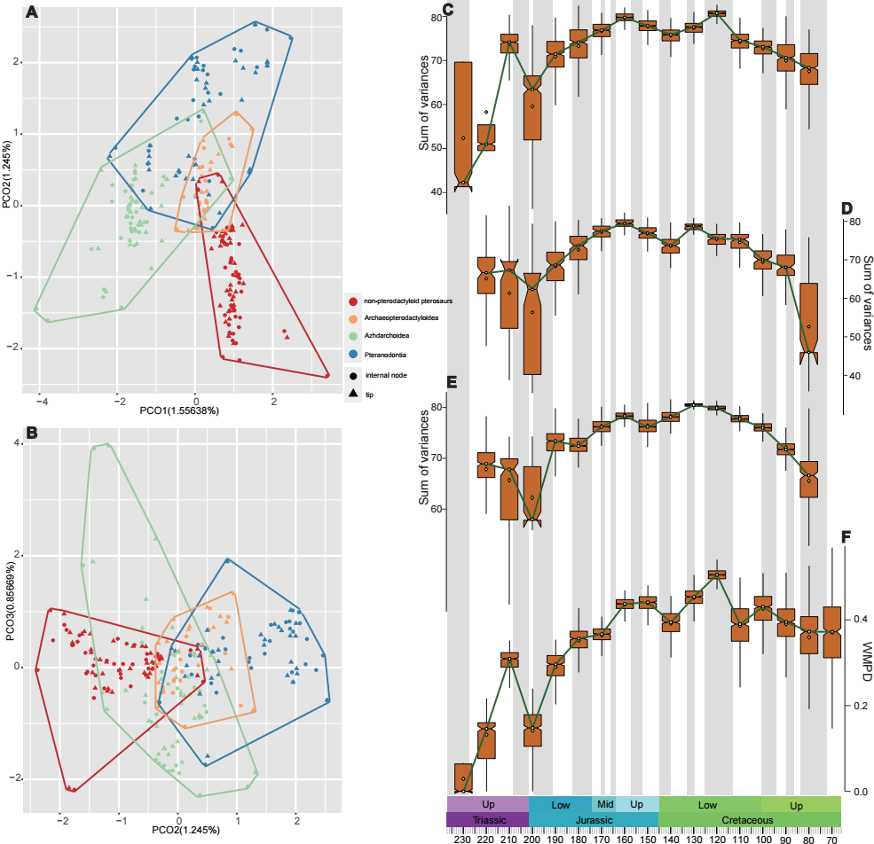 ·使用贝叶斯系统发育回归模型估算了120种翼龙的体重,并进行体型演化速率和祖先状态恢复分析。
