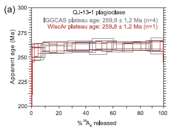 最近,EarthTime核心实验室之一,美国威斯康星大学40Ar/39Ar年代学实验室 Jicha等人,对峨嵋山大火成岩省巧家剖面高Ti区玄武岩斜长石斑晶进行了重新标定,测得其年代为259.8 ± 1.2 Ma(百万年),与李又娟等(2018)在中国科学院地质与地球物理研究所稀有气体实验室,对同一样品的测试结果259.9 ± 1.2 Ma非常一致(图1),也与俄罗斯伊尔库茨克年代学实验室获得的结果261.7 ± 3.4 Ma在误差范围内吻合(International Geology Review)。由此可见,地时-中国40Ar/39Ar定年技术已经达到国际前列。