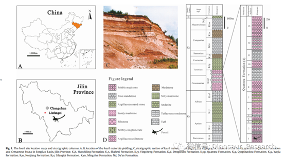图1 化石产地位置图及泉头组地层剖面柱状图