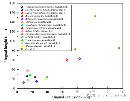 本项研究描述的化石材料包括一个完整的手爪和一节(脚)趾骨(图3)。手爪化石(JLUM-D1-1)外形扁平,呈镰刀状,背部高高隆起,与脚爪形成鲜明的对比,爪骨外侧面具有明显的“Y“字型沟,这些特征指示该标本属于真驰龙类(Dromaeosaurid),为左侧第一指上的爪骨;脚趾骨化石(JLUM-D1-2)相对较短,趾骨轴中部的背腹明显狭窄形成一个深颈,趾骨两侧的韧带窝位于中间偏上,滑车没有明显的背唇,其背缘与前指骨的颈部呈接近垂直的角度相交,通过对比研究认为该标本是左侧第四趾头上连接脚爪的倒数第二节趾骨。研究材料的尺寸比一般的中小型驰龙类大不少,很可能代表了一种与阿基里斯龙(Achillobator)接近的大型驰龙类。该新发现不仅为研究晚白垩世早期驰龙类的演化与分布提供了新的线索,同时也为深入了解东北亚地区白垩纪陆地生态系统的生物多样性提供了重要依据。