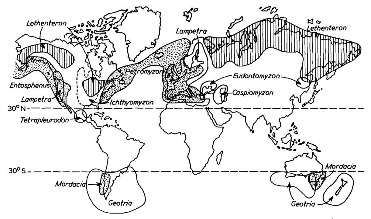 图7. 现代七鳃鳗的全球分布(自 Hardisty 2006)
