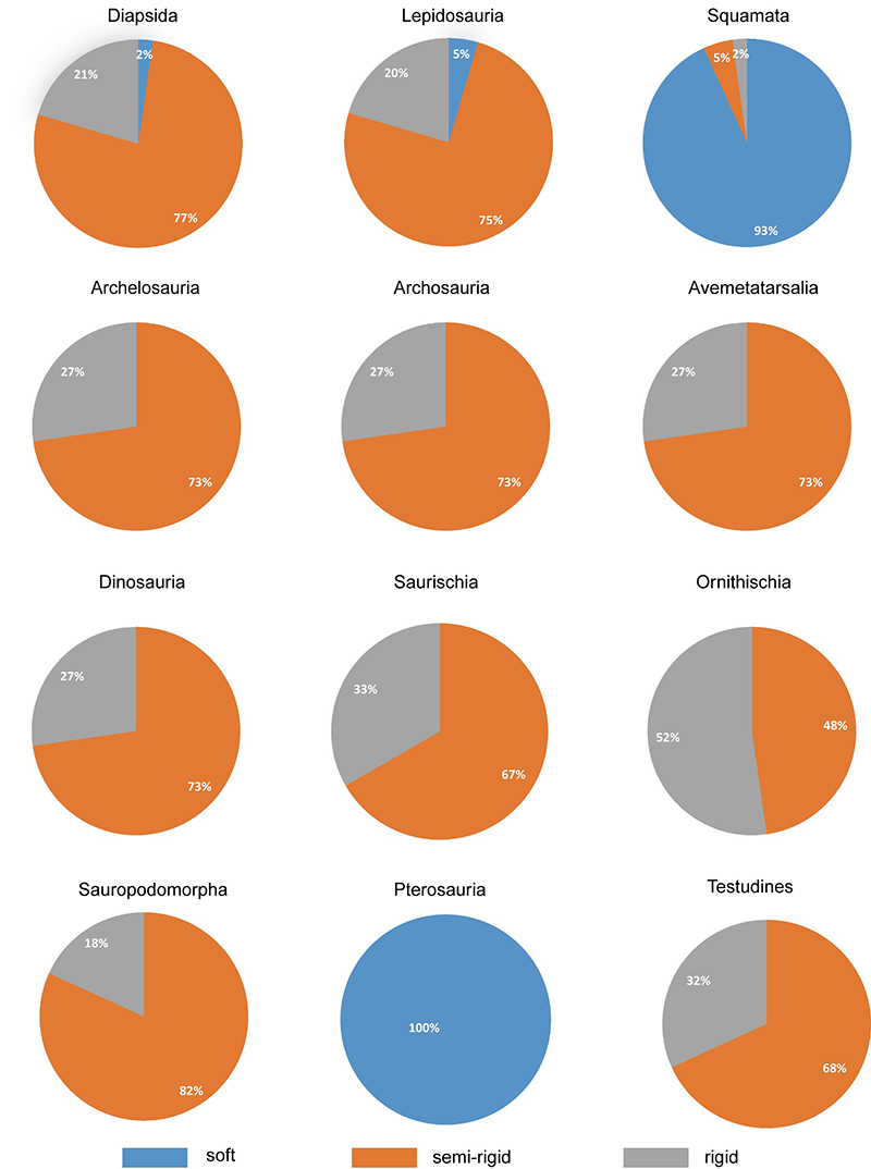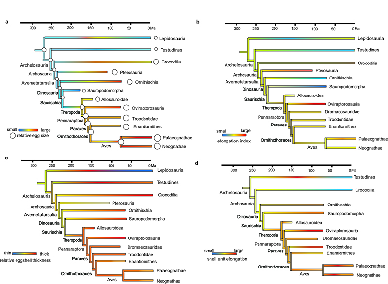 分析结果显示相对蛋大小在节点双孔类和节点蜥臀类之间不断减小,但在节点兽脚类和鸟类之间不断增大,且最明显的增大发生于兽脚类演化早期。相对蛋壳厚度在主龙类的早期演化阶段也存在变小的趋势,但是在兽脚类演化早期存在明显的加厚。蜥脚形类在后期也演化出了较厚的蛋壳。蛋的延长指数在双孔类延伸至鸟类的路径上整体保持稳定,但在一些非鸟兽脚类中急剧增大,如窃蛋龙类。冠群鸟的蛋延长指数有所减小,恢复到了与节点双孔类相似的数值。蛋壳状态的祖先状态恢复显示,最早的恐龙蛋很有可能是革质蛋,且鸟跖类主龙,主龙类和龟鳖类的蛋壳祖先状态可能均为革质蛋,而翼龙蛋壳的祖先状态为软壳蛋。综上所述,最早的恐龙蛋为革质蛋,且相对较小,蛋壳较薄,蛋形态略呈椭圆。冠群鸟类除了拥有相对更大的蛋以外,其多数蛋特征都继承了兽脚类或主龙类的祖先状态(相对蛋壳厚度,较长的壳单元,延长指数)。