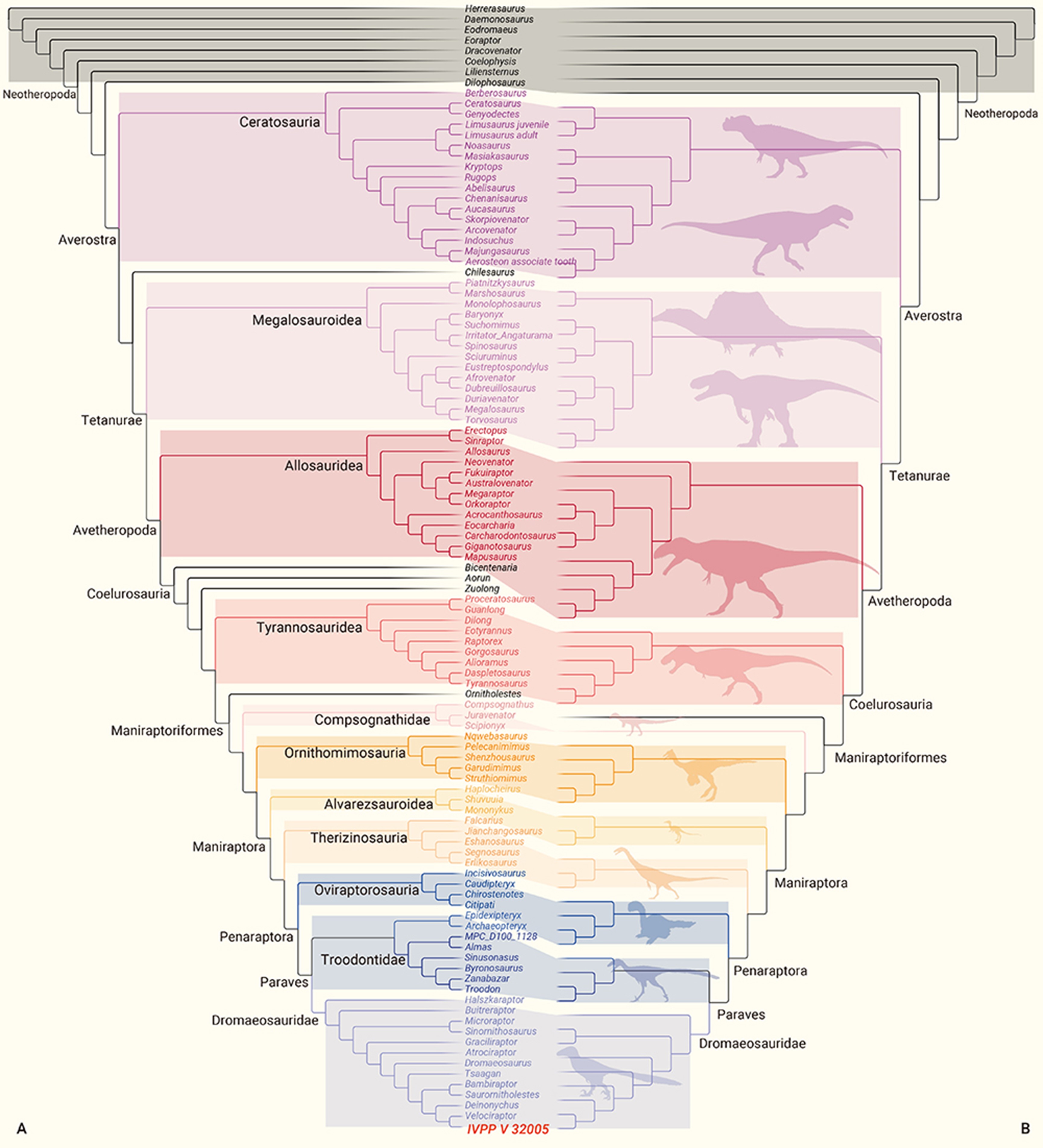 该枚兽脚类牙齿化石发现于东大桥组,年代为中侏罗世。定性的形态学比较显示该枚牙齿与晚白垩世的驰龙类牙齿最为相似。为了定量检验该标本的系统发育位置,研究团队构建了包含146个兽脚类牙齿特征,106个物种的形态学矩阵,并结合限制性搜索,隐含加权法等分析手段进行简约法分析。同时研究团队也将牙齿特征与其它骨骼特征组合起来进行分析。所有的结果都支持该枚牙齿属于进步的驰龙类。