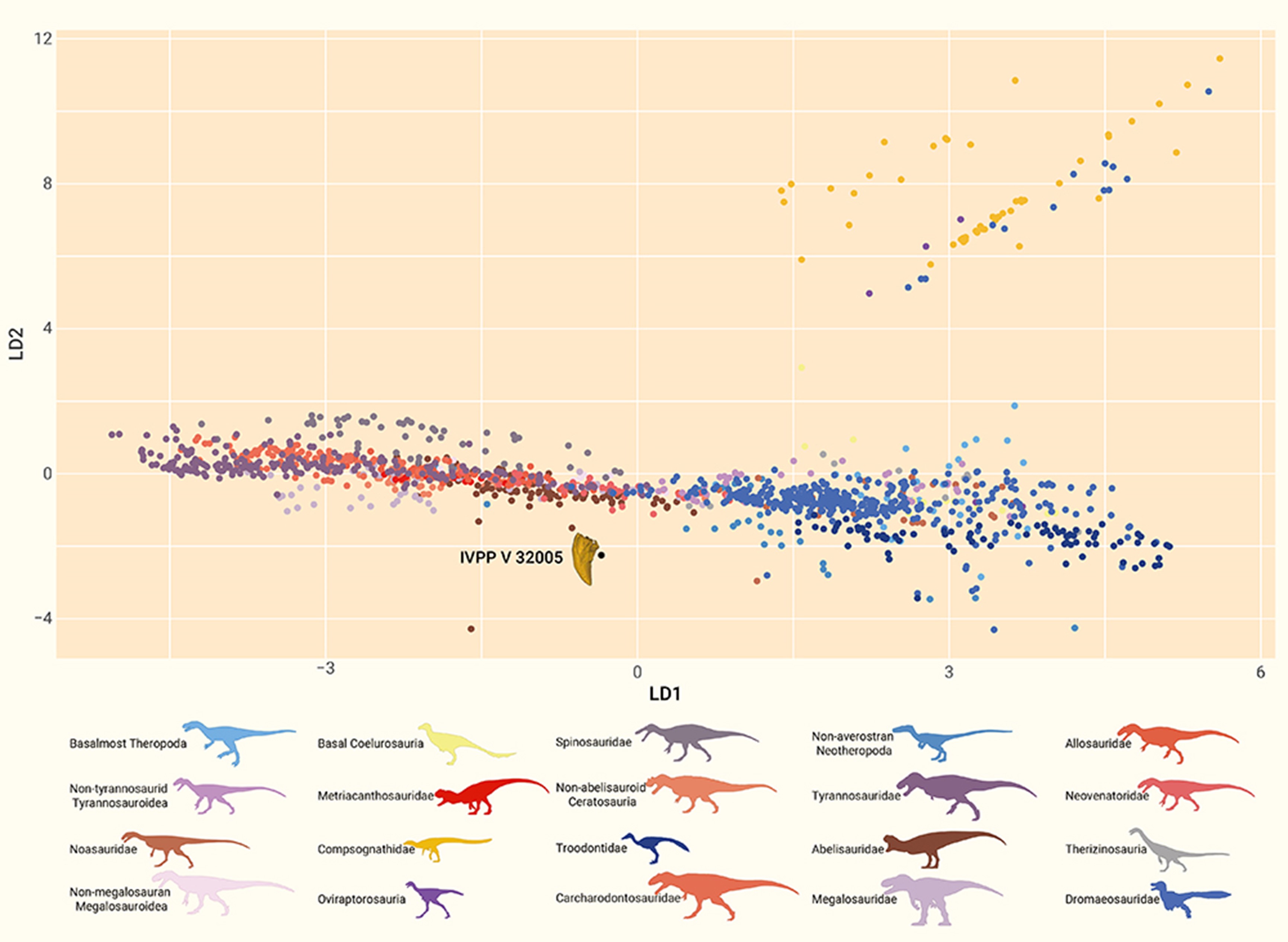 然而贝叶斯末端定年分析显示,在该假设下多数驰龙类的分支事件全都发生于中侏罗世。这一结果显然与化石记录不符。尽管最早的驰龙类可能在中、晚侏罗世就已经出现,但是该类群较为进步的成员的化石记录均出现于白垩纪时期。因此结合化石记录,该枚牙齿化石显然不可能属于进步的驰龙类。另外一方面,驰龙类牙齿的一些特征也存在于其它类群中,因此还需要结合其它方法综合讨论新标本的分类学位置。研究团队使用包含1335颗兽脚类牙齿的数据集进行判别分析。判别分析将该标本归入到中棘龙类。中棘龙类是一类生存于中侏罗世至早白垩世期间的中大型异特龙类。一些中棘龙类的牙齿与驰龙类的牙齿也存在一些相似之处,如都具有较短的锯齿间裂隙和不规则的牙釉质纹饰。结合新标本所处的地质时期,中棘龙类可能是一个更为合理的归属,而它与驰龙类的相似之处则可能是由于食性趋同演化导致的。