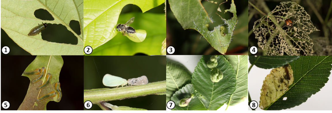 图注:图1甲虫幼虫取食叶片形成孔洞;图2为切叶蜂切出近半圆的叶片;图3为叶蜂幼虫取食叶片分泌白色絮状物覆盖取食痕迹,以防植物挥发气味引来天敌昆虫,;图4为金龟成虫取食叶片,只剩叶片;图5初龄幼虫取食叶片背面;图6为叶蝉刺吸取食植物茎秆,获取汁液;图7为蚜虫在叶脉上诱导形成的袋状虫瘿;图8为象甲潜叶形成的块状潜道。