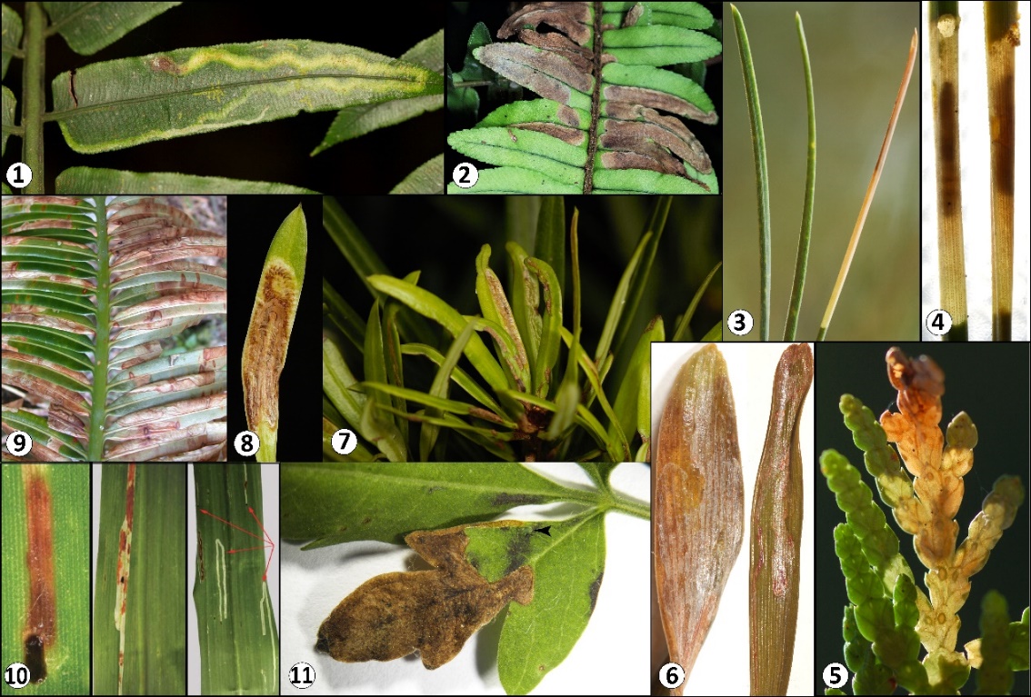 图注:图1为凤尾蕨叶片上微蛾科的潜道;图2为肾蕨叶片上的微蛾科的潜道;图3为松针上麦蛾 (Exoteleia pinifoliella Chambers) 的潜道,细节展示于图4;图5为柏树上的麦蛾 (Coleotechnites thujaella Kearfott) 潜道; 图6为泽米苏铁上的斑潜蝇 (Liriomyza schmidti Aldrich) 潜道;图7为罗汉松上的细蛾 (Phyllocnistis podocarpa Liu) 潜道,细节展示于图8;图9为密克罗尼西亚苏铁上的潜道;图10为甘蔗叶片上的吉丁 (Aphanisticus aeneus Kerremans) 潜道;图11为牡荆上的细蛾 (Phyllocnistis citrella Stainton) 潜道,箭头指示产卵点。