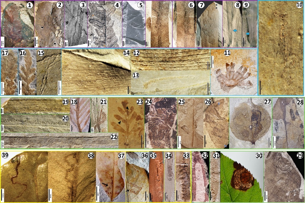 图注:紫色方框1-9代表早三叠至晚三叠各植物群报道的潜叶化石痕迹;蓝色方框10-17为侏罗纪潜叶化石,其中10-15来自中侏罗世中国道虎沟地层;绿色方框18-31代表白垩纪植物群的潜叶痕迹,其中30为现生潜叶蛾在榆树上的潜叶痕迹,与晚白垩世樟树叶片的潜叶痕迹29高度相似;黄色方框32-39代表新生代植物群的潜叶化石,其中39为现生壳斗科叶片上的潜叶痕迹,与中新世壳斗科叶片上的潜叶痕迹38相近。