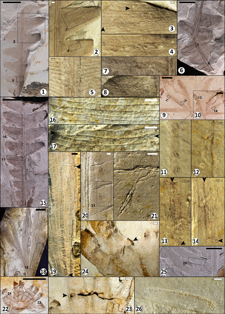 图注:图1为本内苏铁狭角异羽叶上潜叶痕迹DT424,细节展示于图2-4,图5展示叶轴两侧的毛状结构;6-8为海房沟异羽叶上的潜叶痕迹DT424,细节展示图7-8;图9为似银杏叶片上的产卵痕迹(DT175)和潜叶,潜叶DT357放大于图12,潜叶DT414分别放大于图13-14;图15为狭角异羽叶上的潜叶痕迹DT173,分别展示于图16-17;图18为似银杏上的潜叶DT177,细节展示于图19;图20为具毛异羽叶上的潜叶DT295,细节展示于图21;图22为本内苏铁繁殖器官Weltrichia上的潜叶DT427,放大于图23-24,箭头指示潜道痕迹;图26为门头沟侧羽叶上的潜叶痕迹DT411。