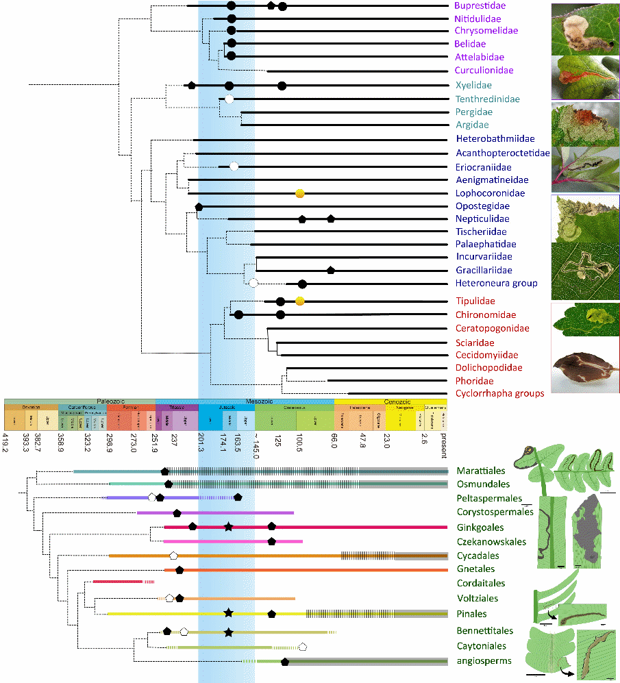 图7 中侏罗世早期潜叶昆虫的谱系发育关系以及不同寄主植物上的潜叶证据(引自原文)