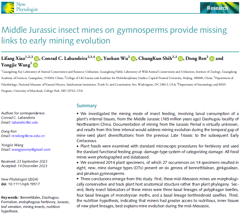 原文信息:Lifang Xiao, Conrad Labandeira*, Yuekun Wu, ChungKun Shih, Dong Ren*, Yongjie Wang*. 2023. Middle Jurassic insect mines on gymnosperms provide missing links to early mining evolution. New Phytologist, DOI: 10.1111/nph.19517