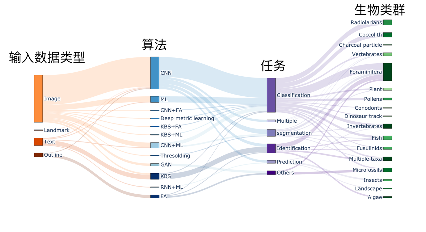 图2. 人工智能古生物学研究使用的输入数据类型、算法、任务、生物类群